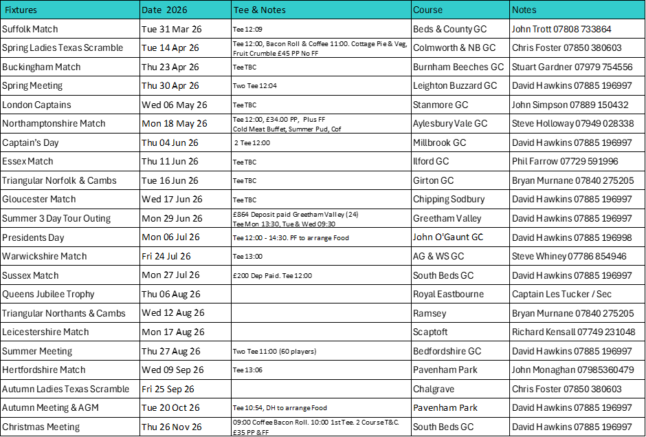 Bedfordshire Golf Captains is open to all Club Captains, past & present of all BCG Ltd affiliated clubs. A member may play in a range of Open meetings within Bedfordshire and also represent Bedfordshire Golf Captains in matches with other Counties. If you are interested in joining our family of 200 plus Bedfordshire Captains please contact,